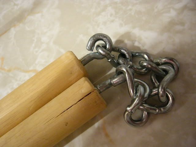 . What I did was I just got a nice length and width of dowels, cut it down to I think it was 30 centimetres for each handle(?) and then drilled a small hole into the centre of the top of each handle and screwed in these (forget the name) screws which have a loop at the end (sort of like a key hanger only bigger). Then you can bend the loops so you can set a chain through it and bend it back. You can also cut the chain down to whatever length you want with bolt cutters. If you really want a nice set then you can probably find some very strong dowels (probably have to order them through a catalog online or offline). Then you could drill a deep fine hole through the center of the dowel and set a nylon rope into it and just dump the glue in
