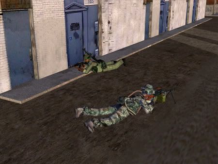 after giveng my AI troops an advance to contact order i was pleasantly suprised to watch them moving using a kind of overwatch technique. you can see here, the two chr's at the rear have positioned themselves to provide cover fire if needed for the two advancing in the front.